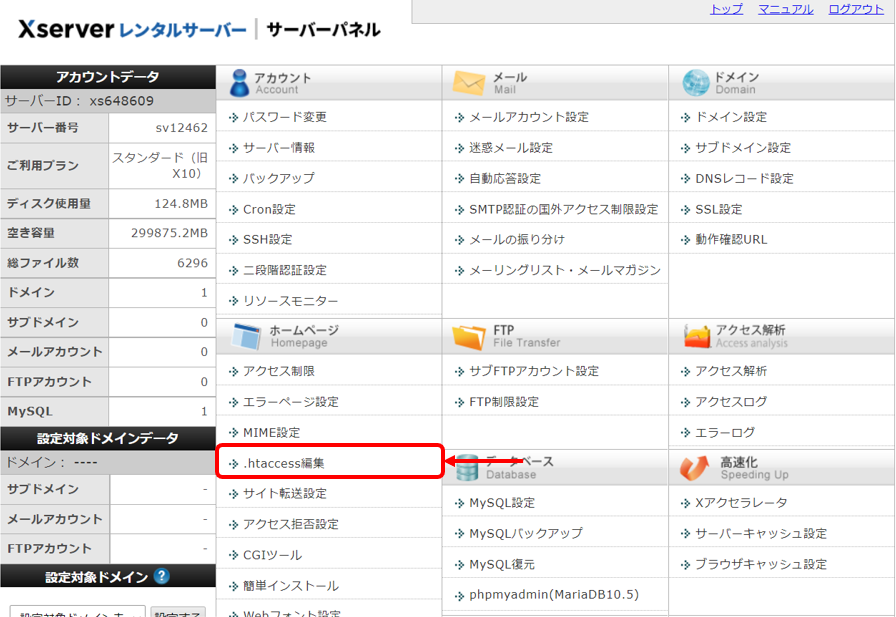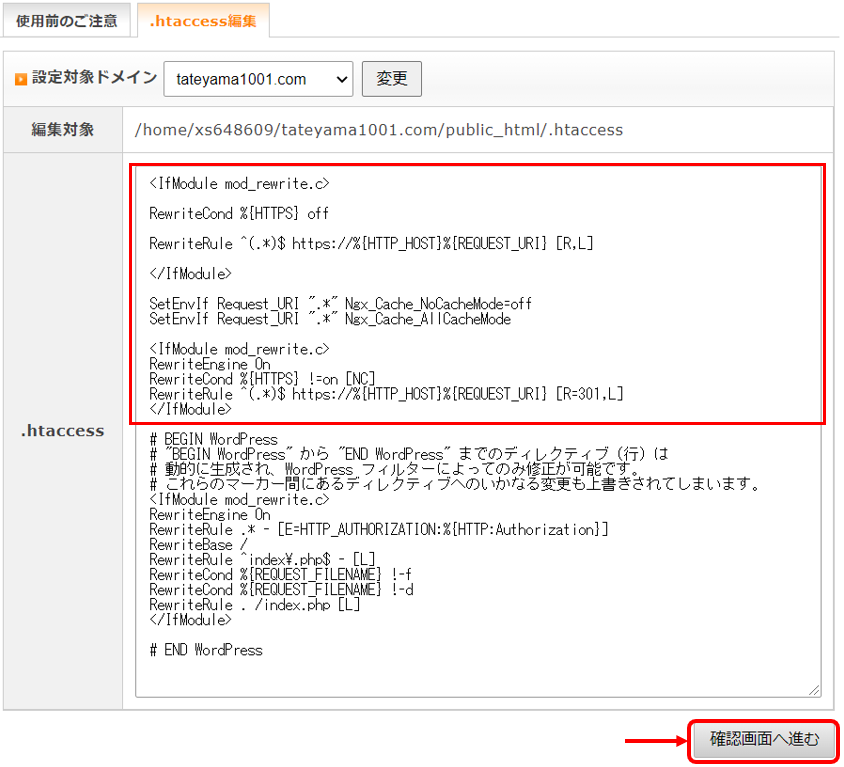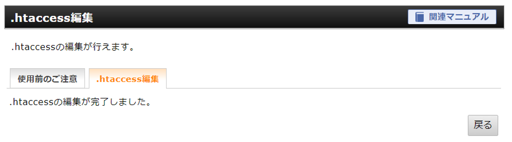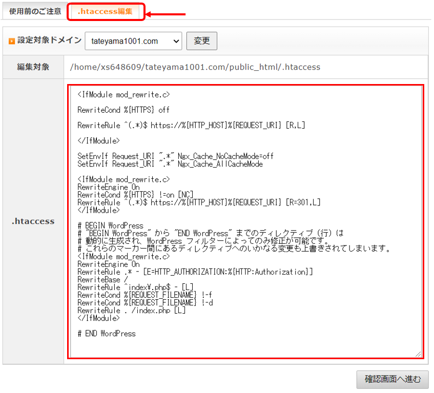 「.htaccess編集」のタブをクリックすると編集画面が表示されます