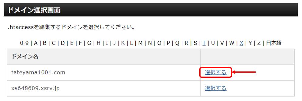 以下のように出てきたら、作成したドメインの「選択する」をクリック