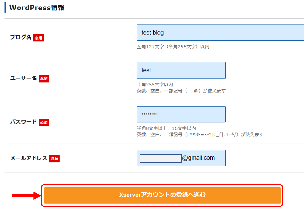 続いてWordPress情報を入力し、Xserverアカウントへの登録へ進むをクリックします。