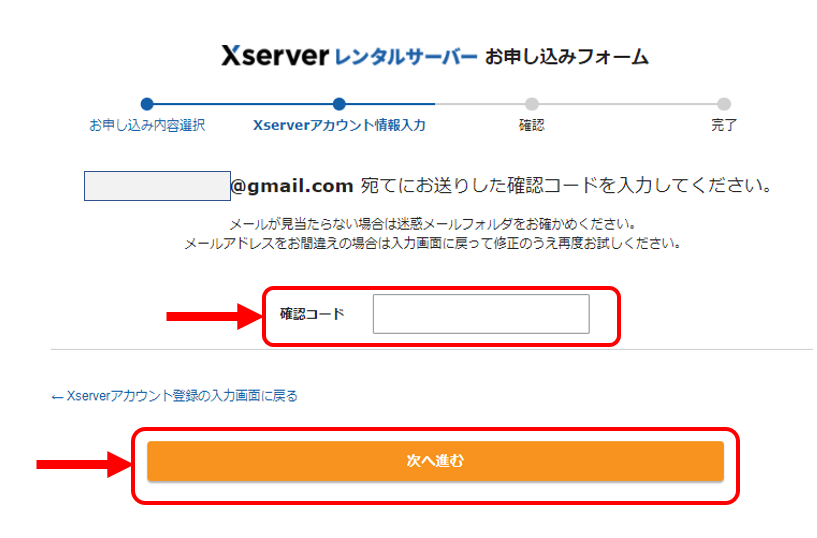 必要事項を入力し「次へ進む」と登録したメールアドレスに「認証コード」が送られてきます。