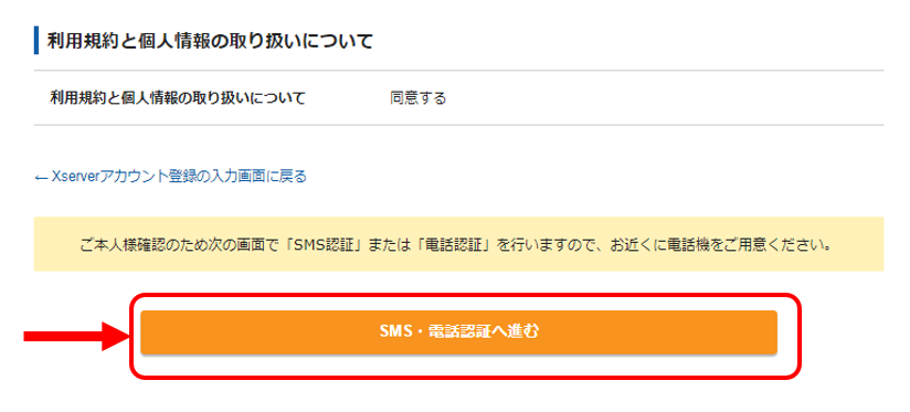 「入力情報の確認」画面で間違いがないか確認し、「SMS・電話認証へ進む」をクリックします。