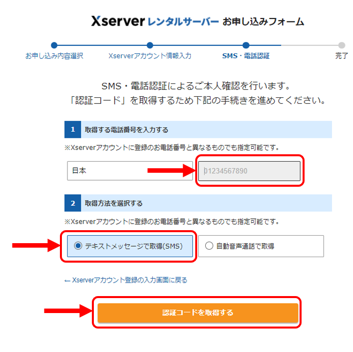 電話番号を入力し、「テキストメッセージで取得(SMS)」にチェックを入れ、「認証コードを取得する」をクリックします。