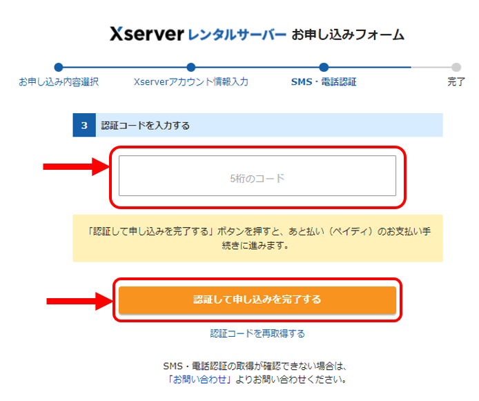 送られてきた、5桁の「認証コード」を入力し、「認証して申し込みを完了する」をクリックします。