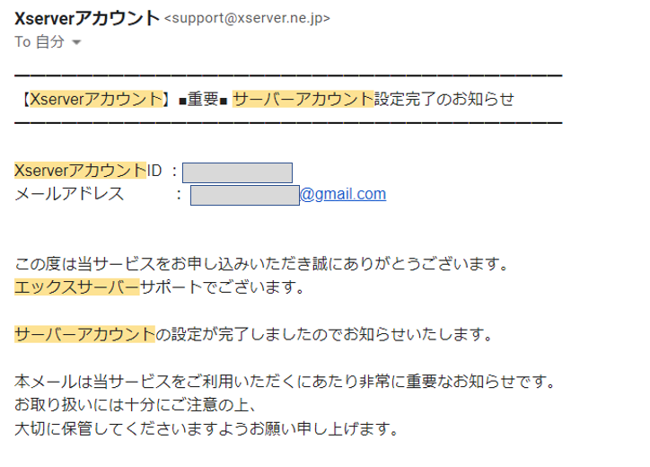 契約が完了するとXseverからサーバーアカウント設定完了のお知らせメールが届きます。