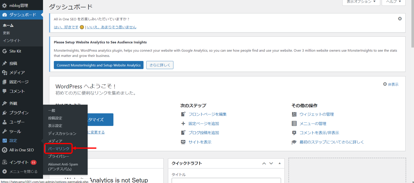 パーマリンクの設定方法はWordPressの「ダッシュボード」から「設定」→「パーマリンクの設定」をクリック。