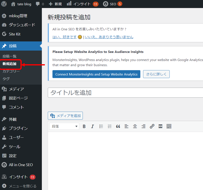 手順① タイトルを入力(ブログのタイトルです。今回はテストです。)