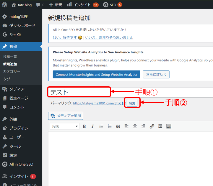手順② タイトルを入力後に表示されるパーマリンクの「編集」をクリック