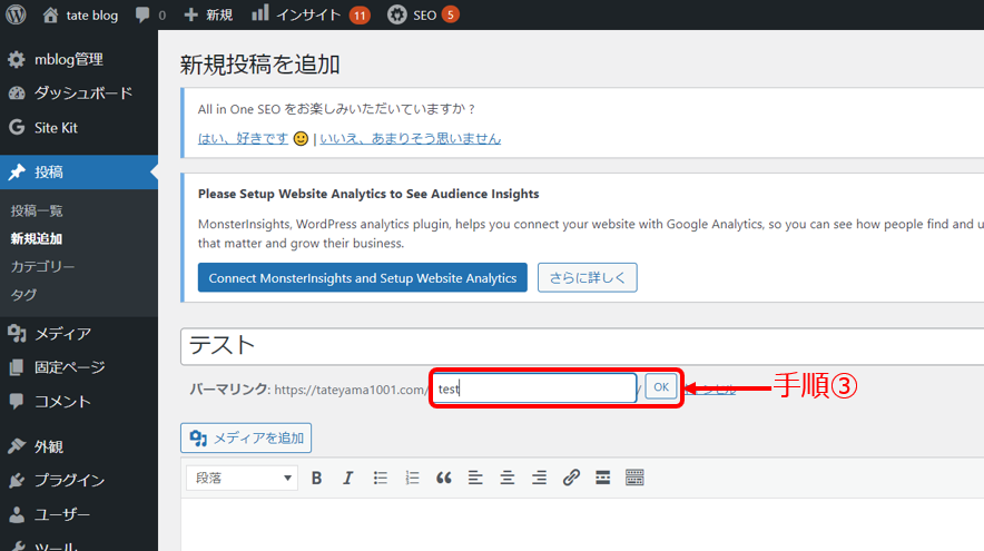 手順③ 記事のURLとなる好きな文字列を入力して「OK」をクリックして完了です。