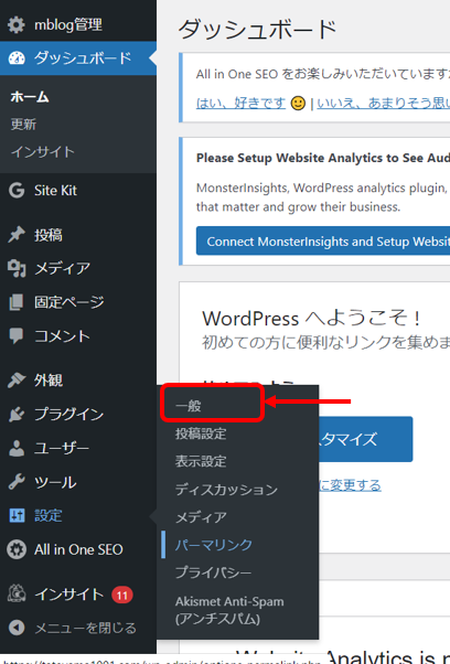 「ダッシュボード」の「設定」から「一般設定」にすすみます。