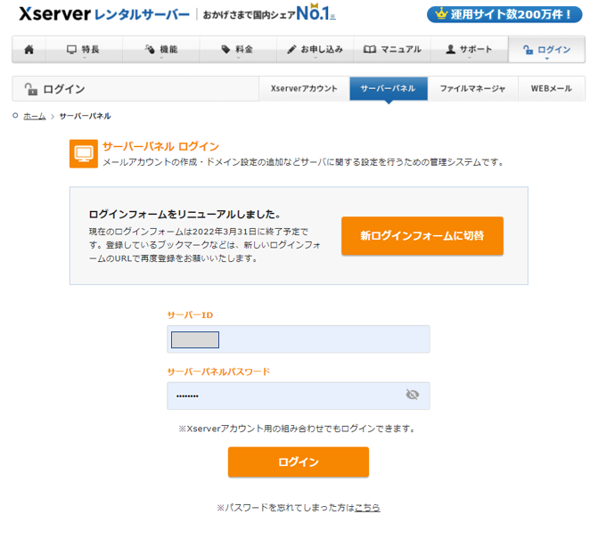 「サーバーID」と「サーバーパネルパスワード」を入力してログインします。