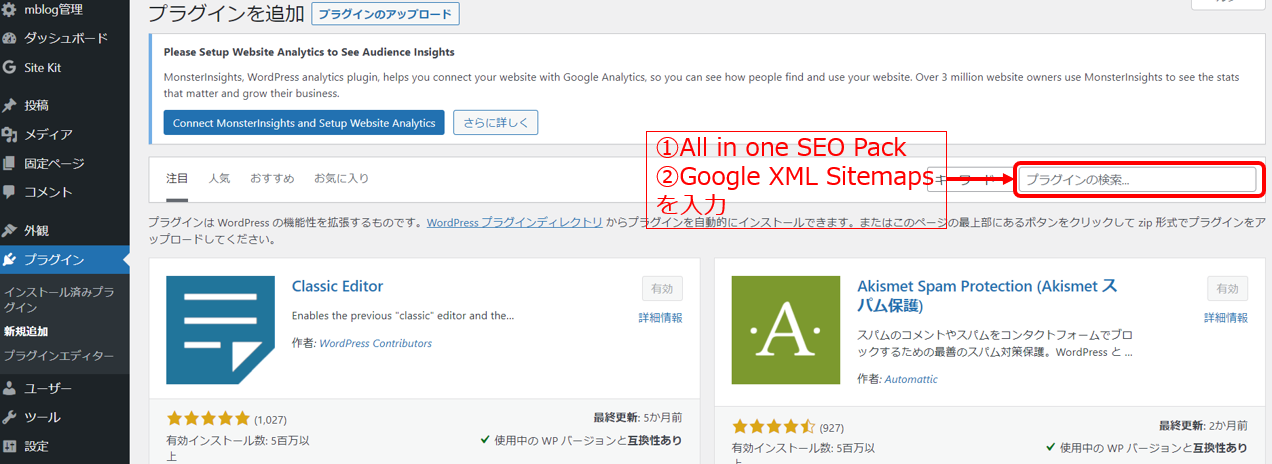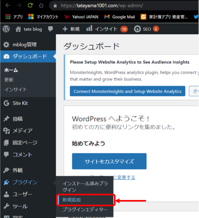 WordPressの左側のメニューから「プラグイン」→「新規追加」をクリックします。