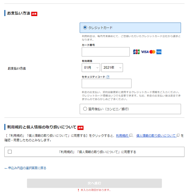 決済にあたってクレジットカードを準備していると今後の継続利用には便利です。