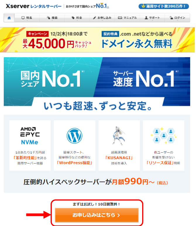 サーバーを申し込みます。オススメは国内シェアナンバー1の「エックスサーバー」です。